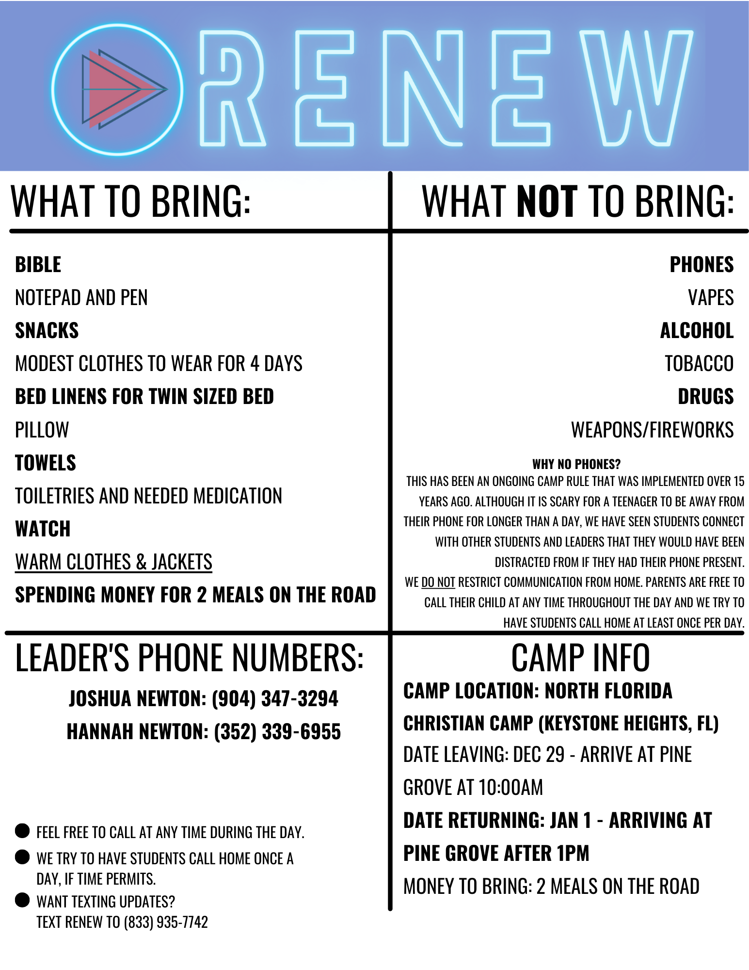 1) The packing list - we know sending your student away for a few days can be scary and you may not know what all you need to bring! This packing list is a starting point so you don't forget a thing!